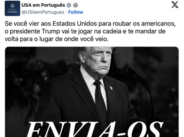 O governo dos Estados Unidos publicou, em português, uma mensagem ameaçando imigrantes que pretendem entrar no país. Em um post divulgado nesta quinta-feira (15) no perfil em língua portuguesa do Departamento de Estado nas redes sociais, a administração de Donald Trump afirmou que pessoas que viajarem aos EUA com a intenção de “roubar os americanos” serão presas e deportadas.