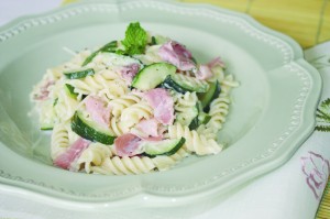 O zucchini e hortelã são adocicados e suaves. A combinação entre os dois é perfeita. O prosciutto dá contraste no sabor e na textura do prato. O tipo da massa curta é preferencial.