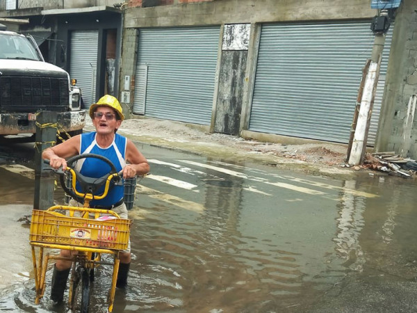"Faltaram dez casas para chegar [a água]", diz ele, que se locomove de bicicleta para fechar as vendas e, com a enchente, tem que desviar de ruas e pedalar por maiores distâncias.