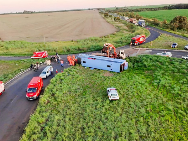 O veículo, que tinha 46 ocupantes, saiu de Anápolis (GO) com destino a Ribeirão Preto (SP). “Sobre a dinâmica do acidente, o motorista teria perdido o controle da direção do veículo, atravessando o canteiro central do entroncamento que liga as rodovias MG-223 e a LMG-413 e capotando na alça de acesso”, diz nota dos bombeiros.