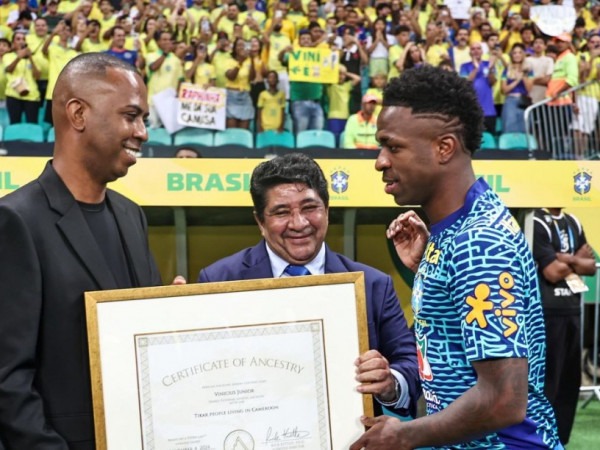 As celebrações do dia da consciência negra, feriado nacional nesta quarta-feira (20), foram antecipadas pela CBF, na noite véspera, nas Arena Fonte Nova, palco do Brasil x Uruguai, em Salvador (BA). O atacante Vinícius Júnior, expoente da luta contra o racismo no Campeonato Espanhol, foi presenteado com um certificado de ancestralidade. O craque nascido em São Gonçalo (RJ) descobriu que seus antepassados mais longínquos eram de Camarões, no continente africano, provenientes do povo Tikar.