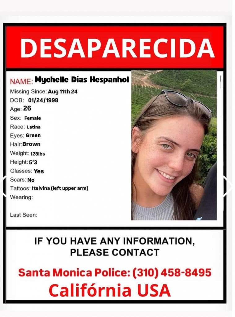 Mychelle Dias Hespanhol foi vista pela última vez na segunda-feira (12) por volta das 18 horas em um Airbnb em Santa Mônica, Los Angeles.