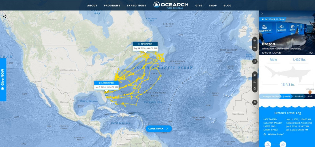 Breton foi o primeiro tubarão marcado por autoridades da vida selvagem durante a Expedição Nova Escócia 2020 da OCEARCH. Ele é um dos cinco tubarões marcados na Ilha Scatarie em dois anos de trabalho lá, fornecendo evidências de que a região poderia oferecer acesso previsível aos tubarões brancos.