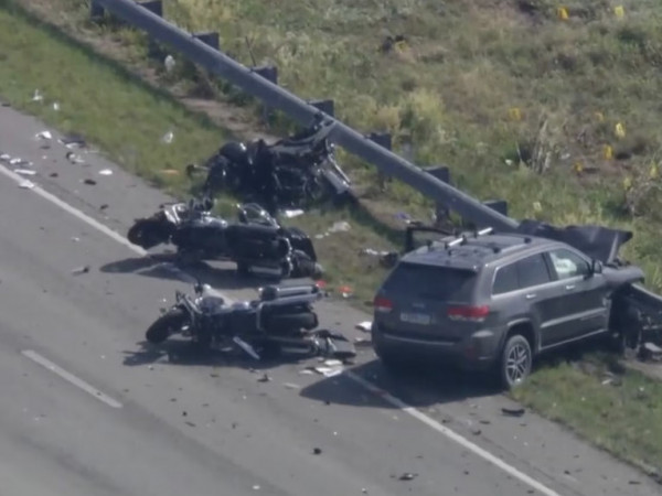 Imagens aéreas do Chopper 6 mostraram as três motocicletas danificadas no chão, ao lado de um SUV, que também sofreu danos graves na parte frontal.